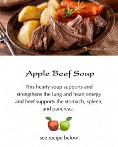 This hearty soup supports the lungs, stomach, spleen, and pancreas. When made with oil, it also benefits the heart. Beef is particularly nourishing for the stomach, spleen, and pancreas, making it a great choice for those who are not vegetarian.